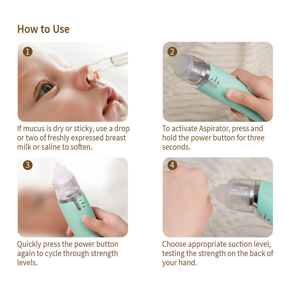 For dry or sticky mucus, spray saline solution to soften the mucus first.Press and hold the power button to activate suction, then again to cycle through the three different strengths from lowest to highest.After selecting the appropriate suction strength, insert the silicone tip into your child's nostril, ensuring there are no gaps. This makes the suction more effective.When finished, gently remove the aspirator from your child's nose. Hold down the power button until the light turns off. Remove the collection container by carefully twisting it to the OPEN position and emptying it.