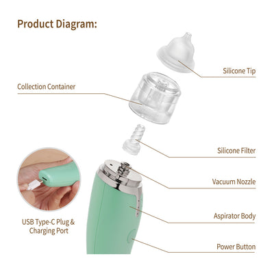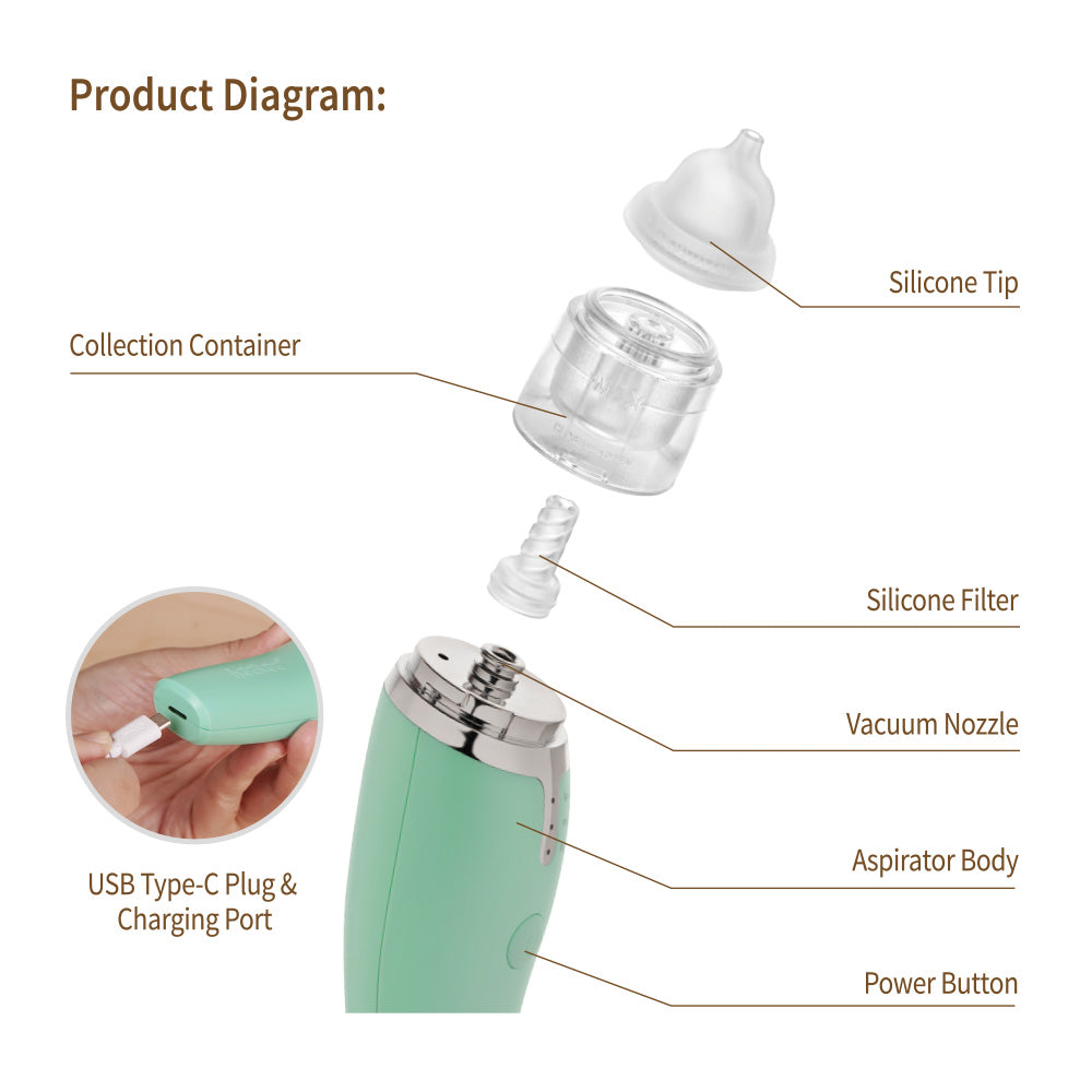 Our Rechargeable Baby Nasal Aspirator provides continuous suction with no backflow and is easy to disassemble for cleaning, making it perfect for busy households. It even comes complete with a tube cleaning brush to let you get into all those tiny nooks and crannies for a thorough clean!