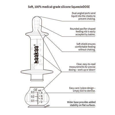 Administer medications and feed liquids to your little one safely and easily with Haakaa's SqueezieDOSE Silicone Dispenser! The unique silicone bulb design is an excellent alternative to traditional hard plastic syringes. It allows you to use it one-handed, giving you effortless control over the flow rate with a simple squeeze. Measurement is precise to 1ml. This dispenser is specially designed to allow fuss-free measuring, filling, and feeding. wider base gives added stability on flat surfaces. Haakaa SqueezieDose Silicone Dispenser stands out as the sole product in the market crafted exclusively from medical-grade silicone.